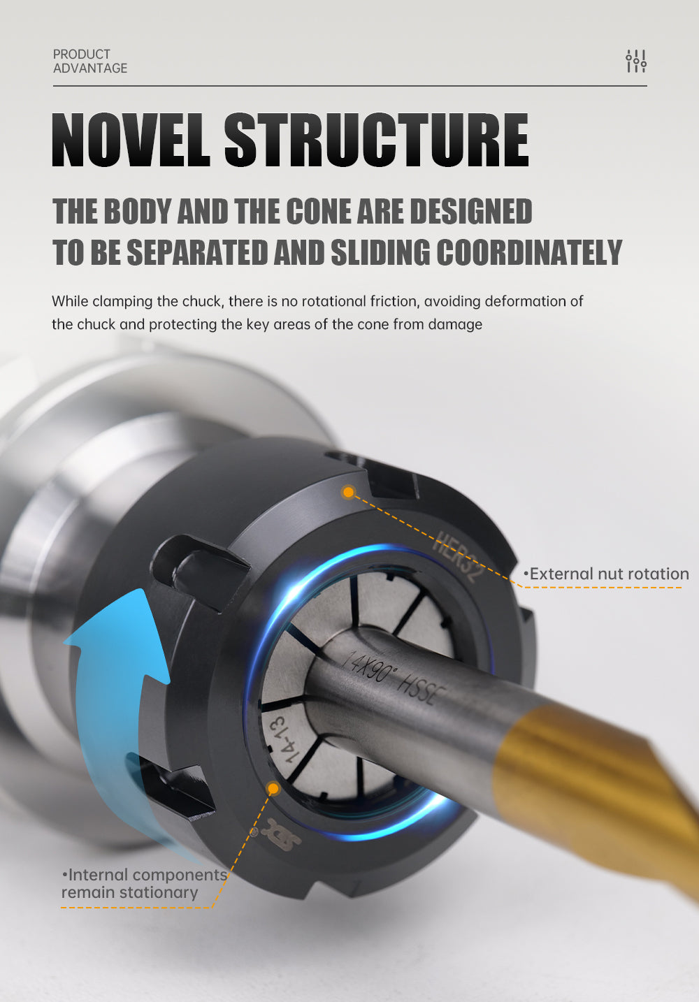 Features a separated body and cone design for sliding coordination during chuck clamping. External nut rotates while internal components remain stationary.