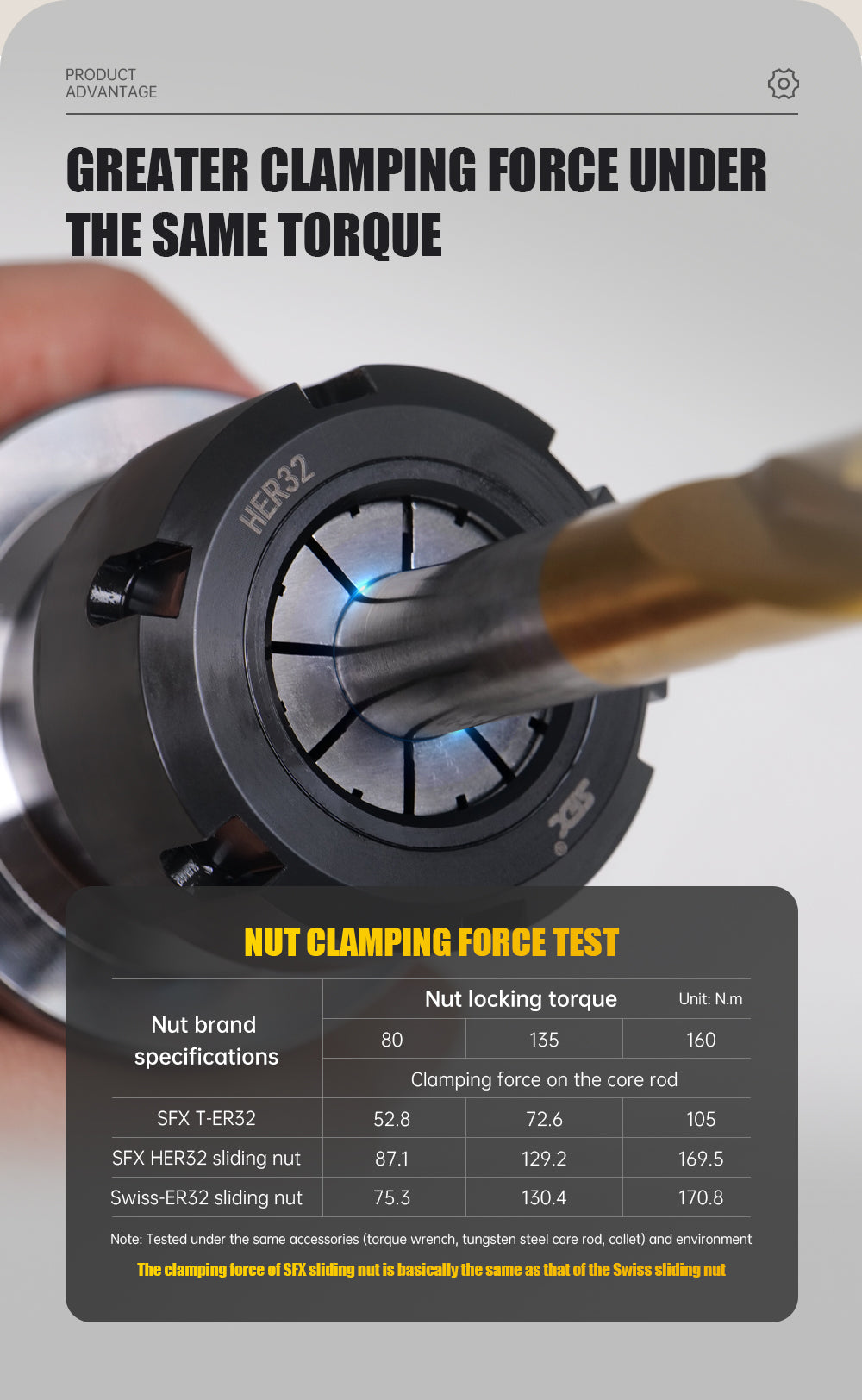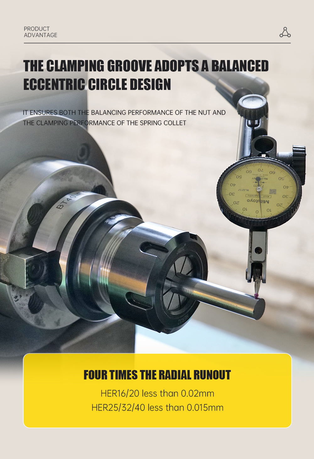 The clamping groove adopts a balanced eccentric circle design for improved performance, ensuring both balancing of the nut and effective clamping with the spring collet.